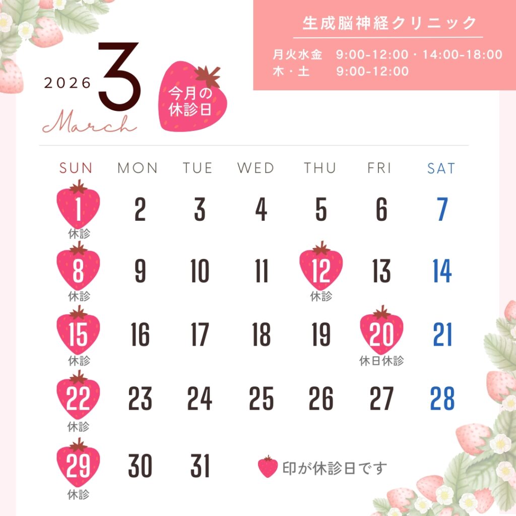 🎎2026年3月の休診日のお知らせです。 2026年2月24日 / お知らせ情報 🔴3月12日(木):休診 急に春めいてきましたね。花粉症の季節到来です!寒暖差にも負けないように、免疫力を高める日常生活を心がけましょう!