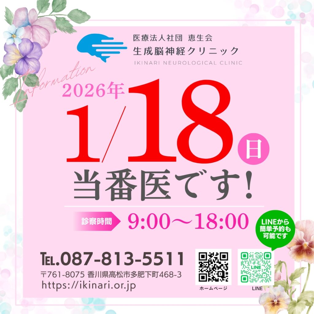 📢2026年1月18日(日曜日)は生成脳神経クリニックが当番医を担当します❗️発熱、頭痛、腹痛などなど。緊急受診の必要な方は、お電話か直接当院外来受付にお越しください。 混み合 […]